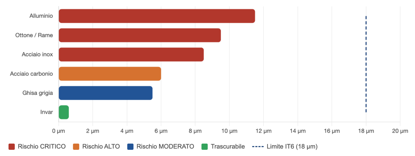 | Materiale | CTE (µm/m·°C) | Espansione su 100 mm con ∆T +5°C | Rischio a tolleranza IT6 |