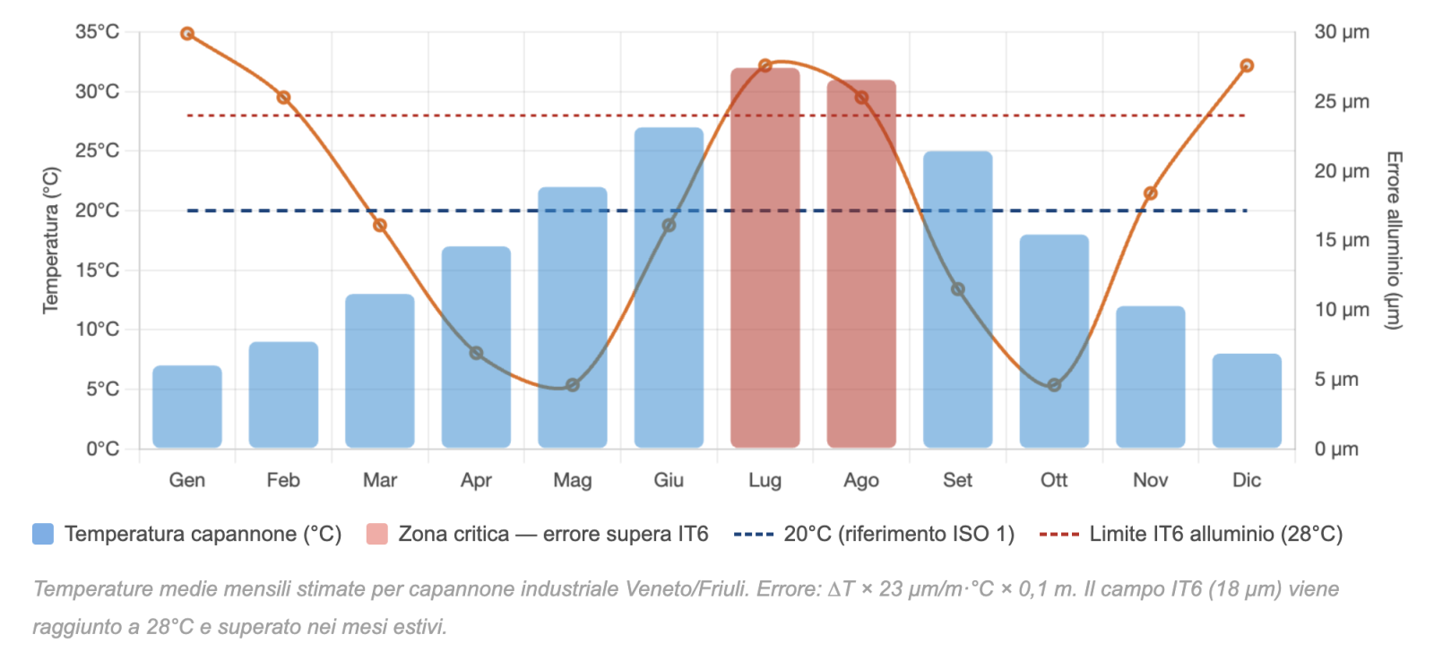 Pezzo in alluminio da 80 mm, tolleranza IT6 (campo ±7 µm). Temperatura capannone: 14°C a gennaio, 32°C a luglio. Differenza: 18°C. Espansione termica: 23 µm/m·°C × 0,080 m × 18°C = 33 µm . Il campo totale di tolleranza è 14 µm. Il pezzo è fuori tolleranza per sola dilatazione stagionale, senza che nulla nel processo sia cambiato.