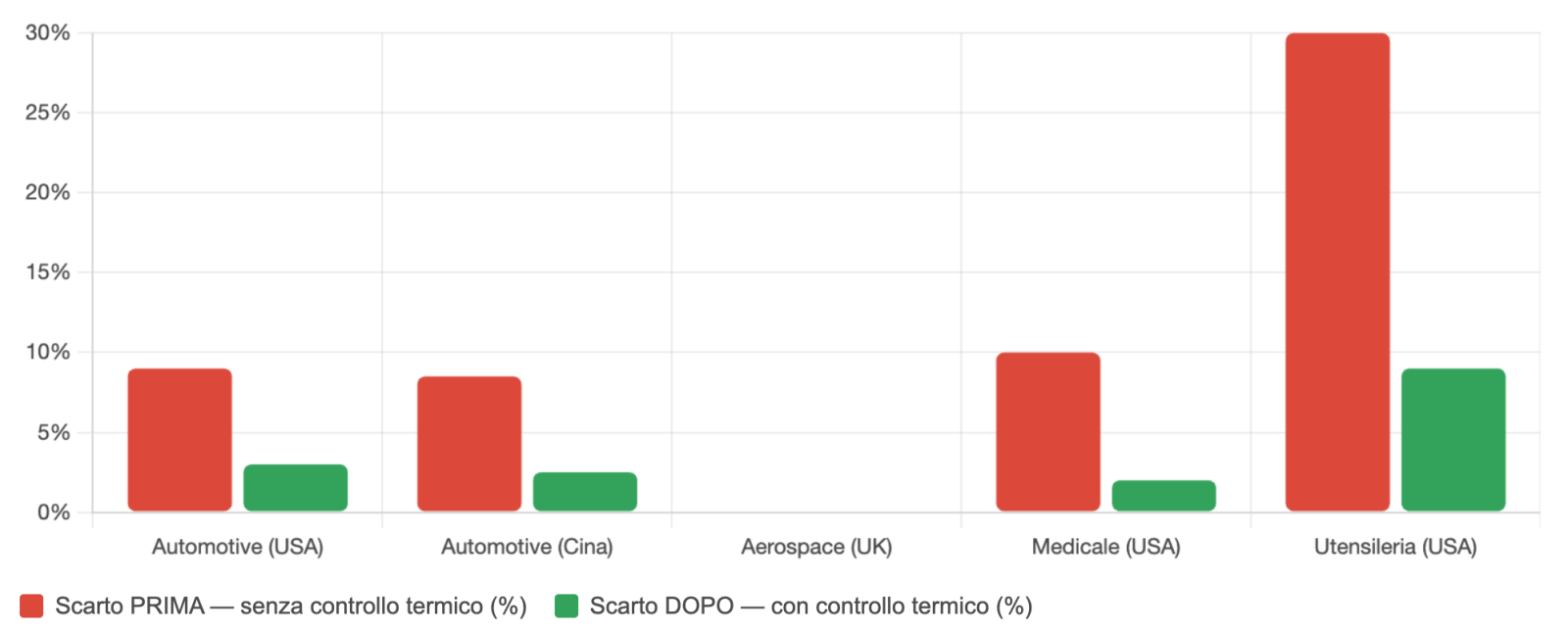 Il dato più significativo è quello di CMS Meccanica Tonon (Treviso): un tasso di non conformità inferiore allo 0,02% non è il risultato di una macchina CNC migliore — è il risultato di un processo controllato in ogni variabile, temperatura inclusa. Per confronto, un'officina standard senza controllo termico lavora tipicamente con tassi di scarto tra il 3% e il 10% a seconda del settore e delle tolleranze richieste.