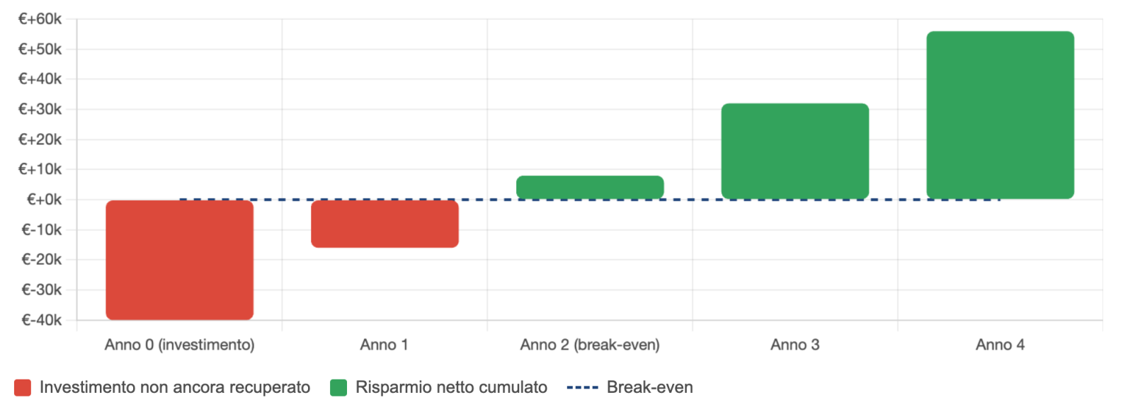 Payback dell'impianto — flusso di cassa cumulativo per una PMI meccanica tipo del Nord-Est